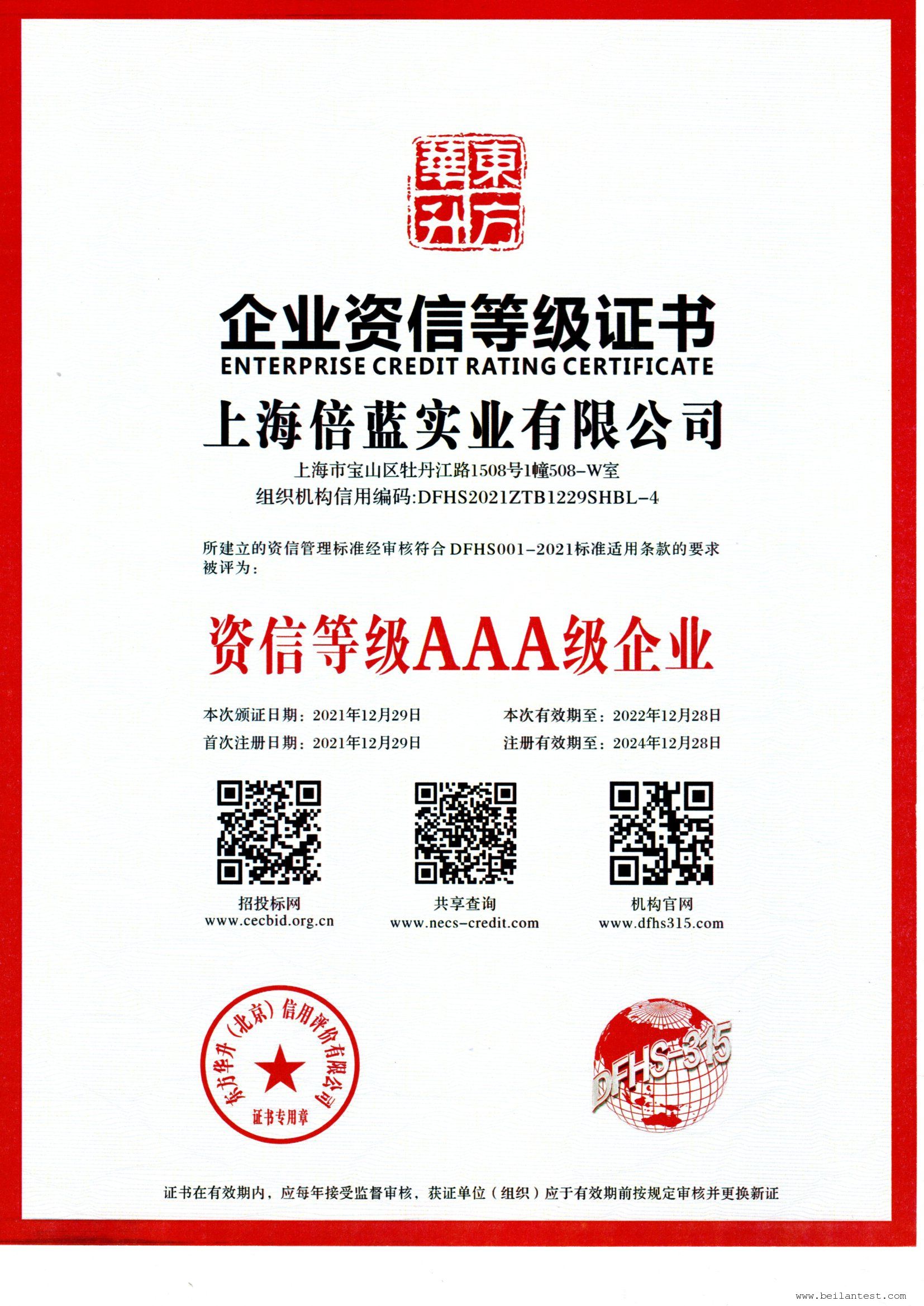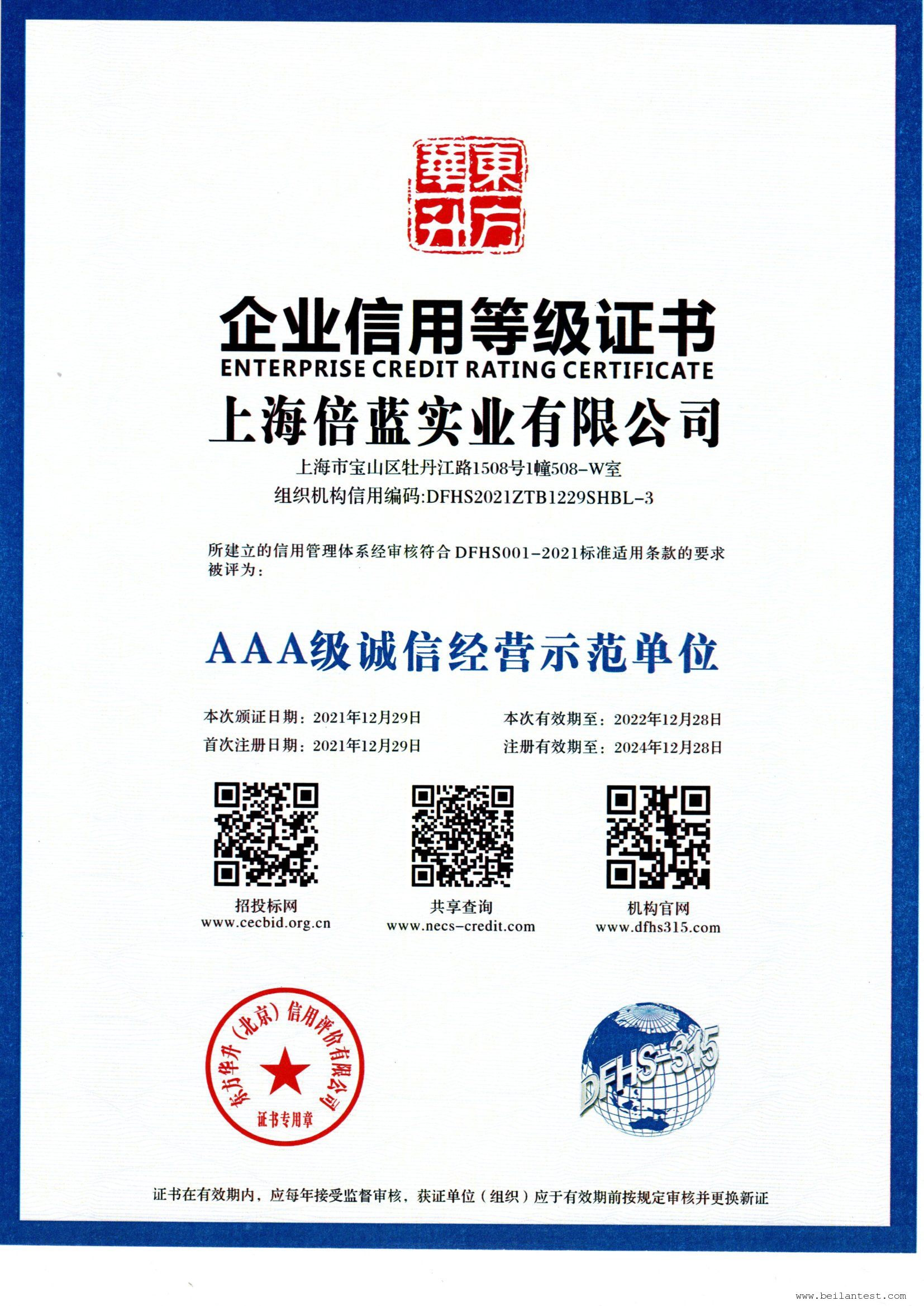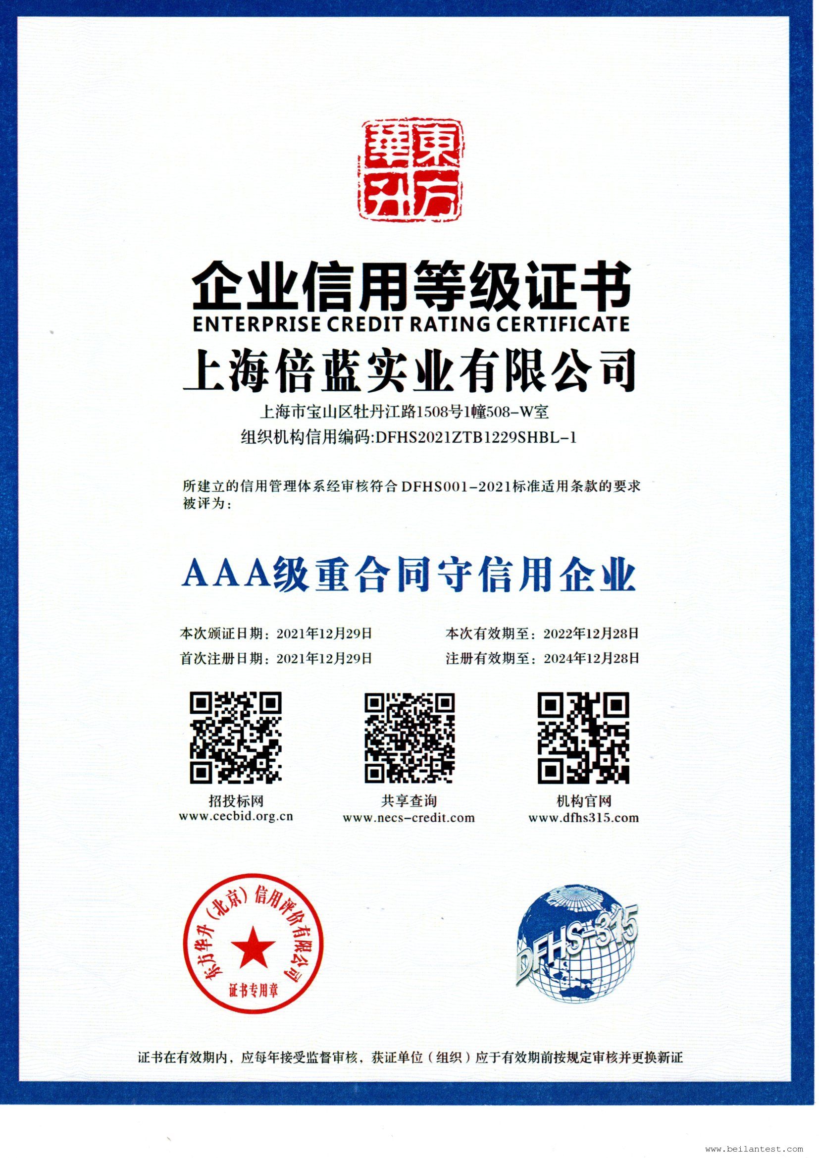 上海倍蓝实业有限公司所建立的信用管理体系经审核符合中国信用行业标准适用条款的要求,通过了信用评价认定,表明我司信用状况极--------佳。上一篇:2022年中秋节放假通知下一篇:没有了