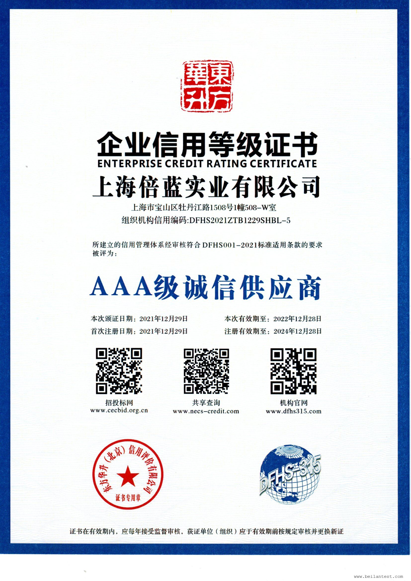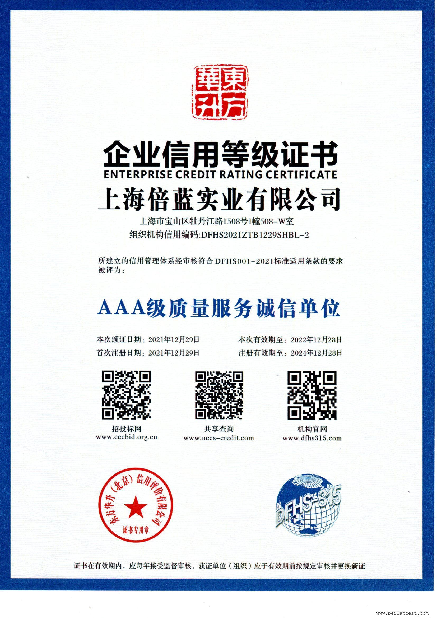 上海倍蓝实业有限公司于于2021年12月29日通过了AAA级信用企业,AAA级资信企业、AAA级重合同守信用企业,AAA级诚信经营示范单位,AAA级质量服务诚信单位,AAA级诚信供应商的评价认定,业务范围辐射本地及全国。