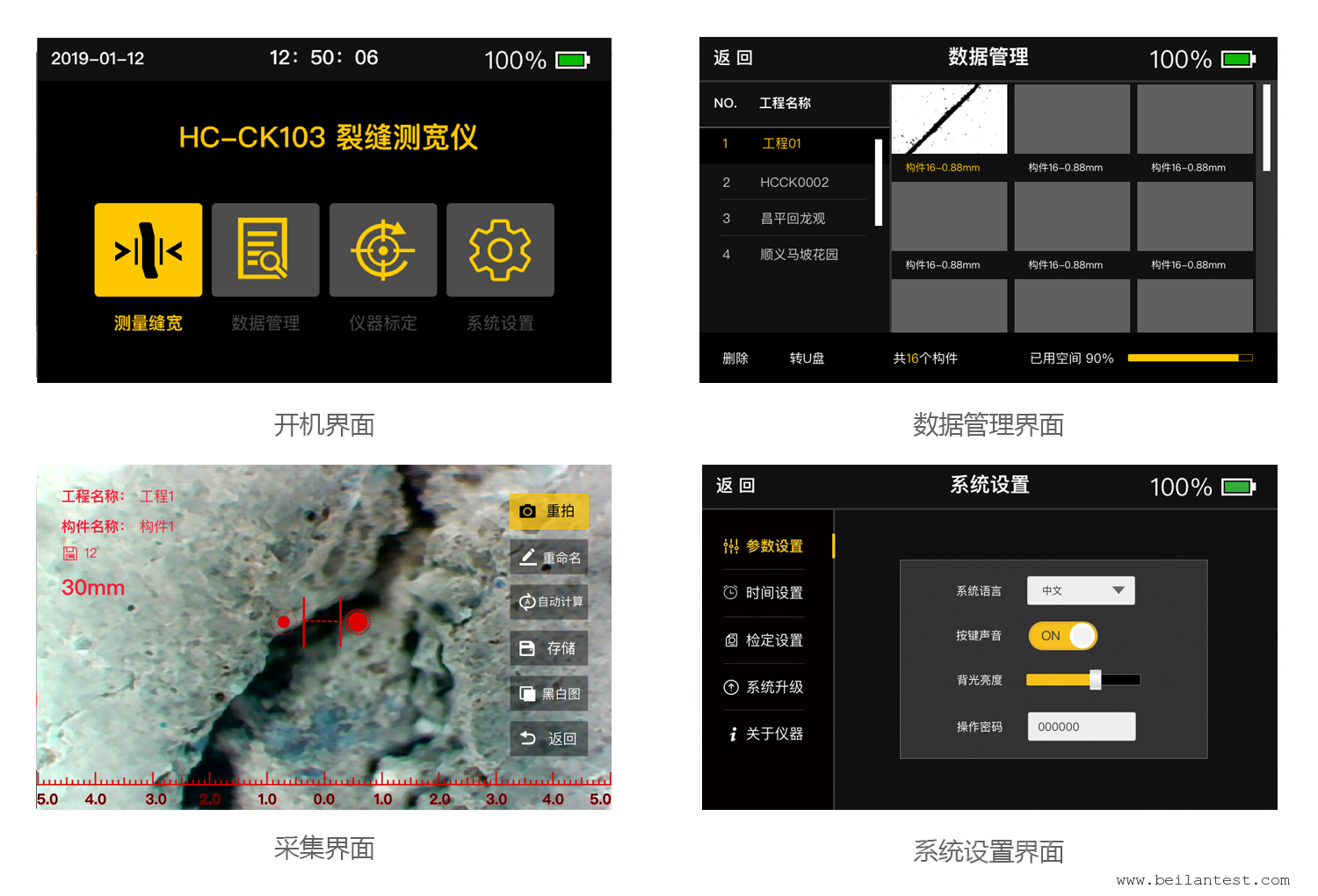 · GB50204-2015《混凝土结构工程施工质量验收规范》HC-CK103裂缝测宽仪产品特点 · 汉字化:全汉字显示,在不同的界面下有相应的中文提示;