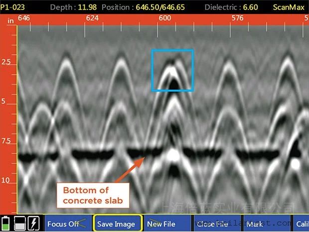 1、数据显示了高架桥梁板中的多层钢筋。底部在20cm(8英寸)深度清晰可见。请注意蓝色框中突出显示的紧密间隔的钢筋。